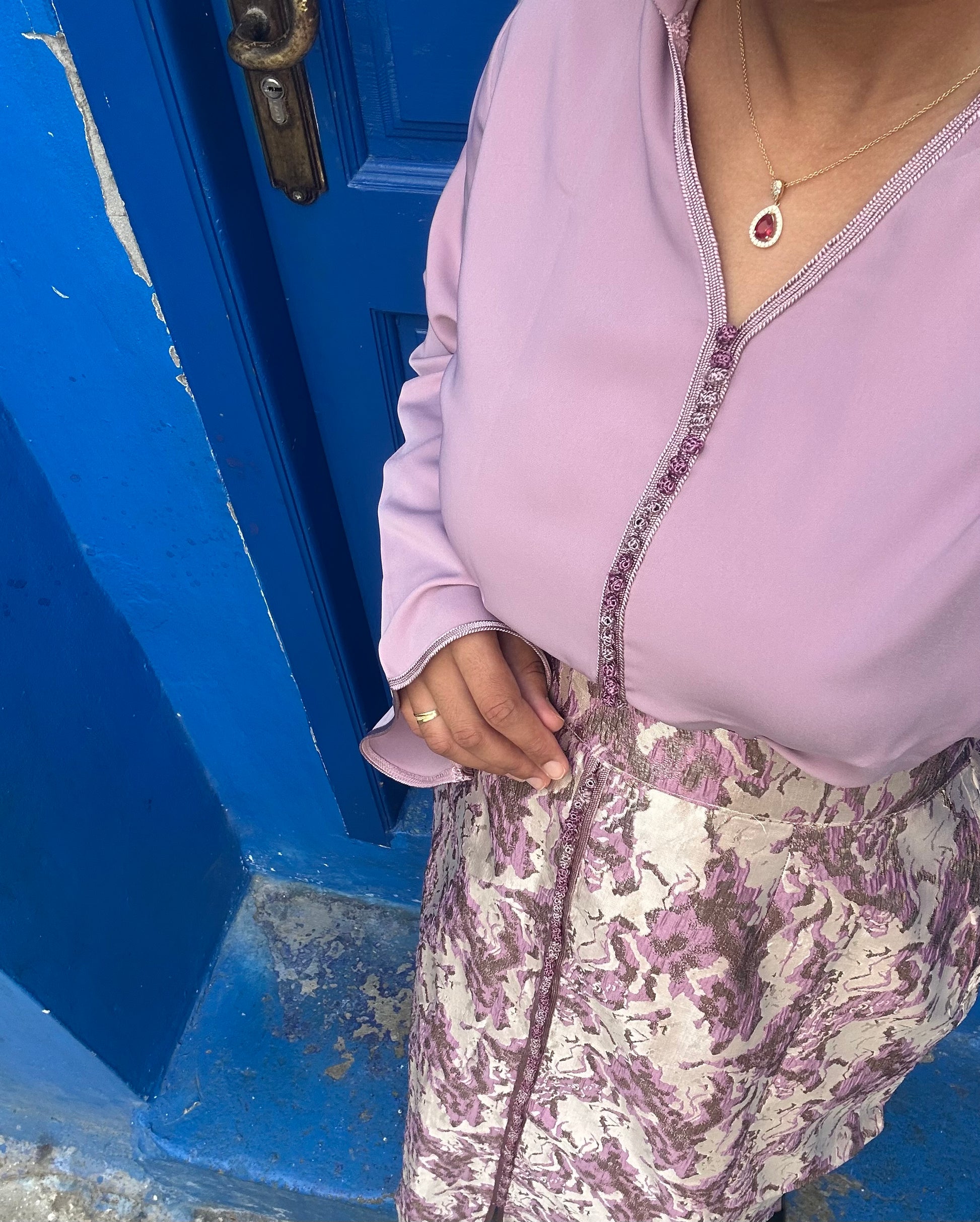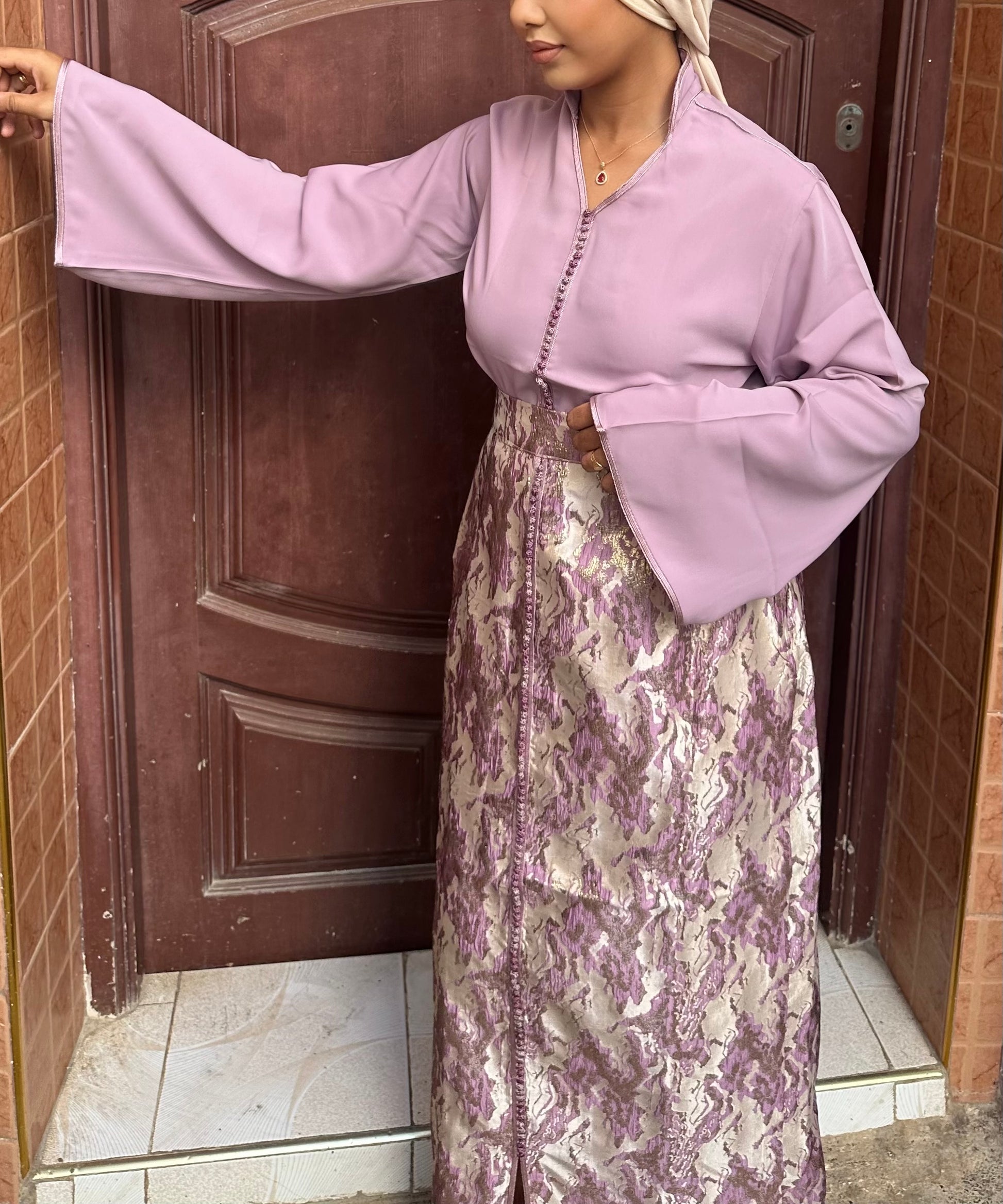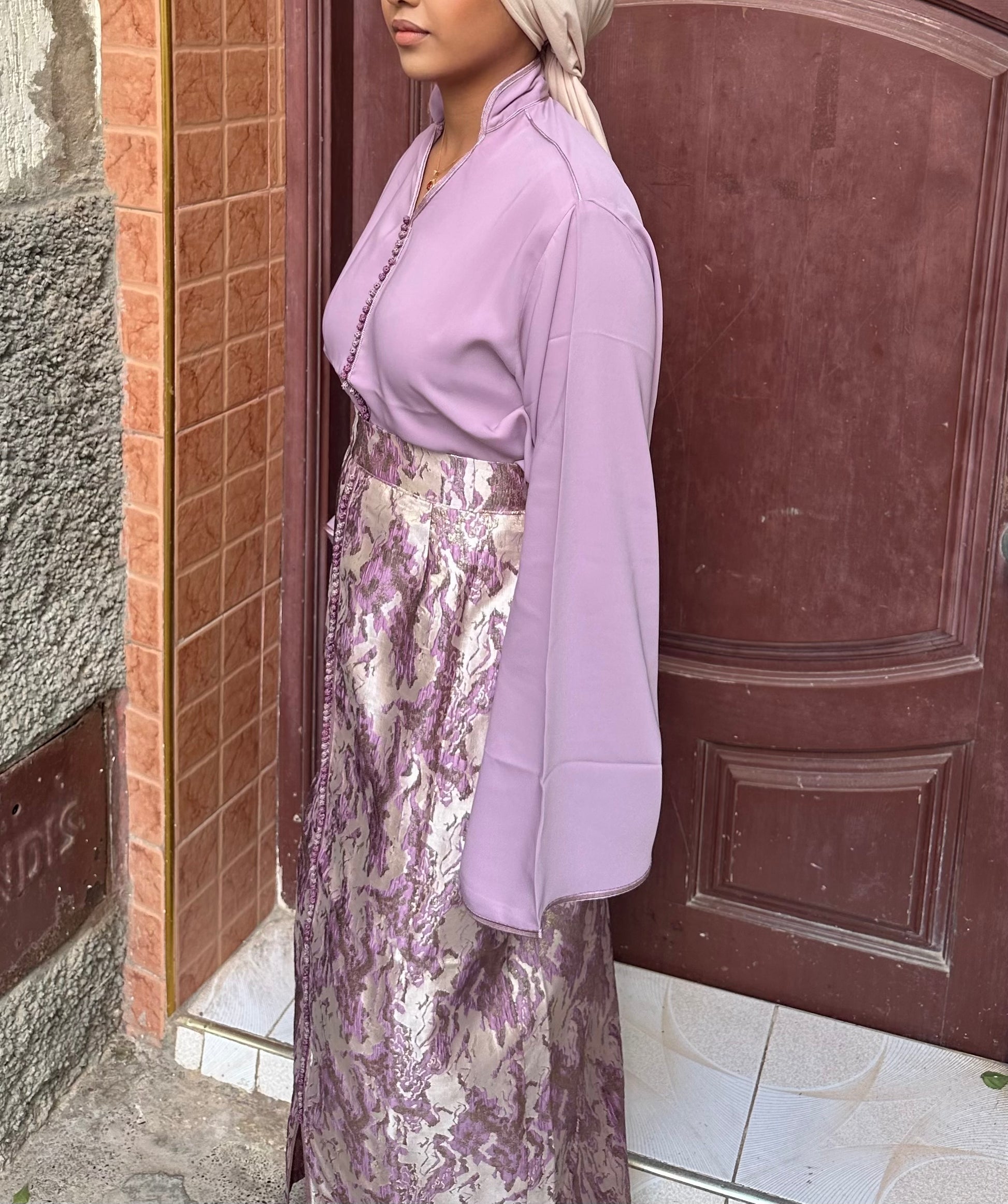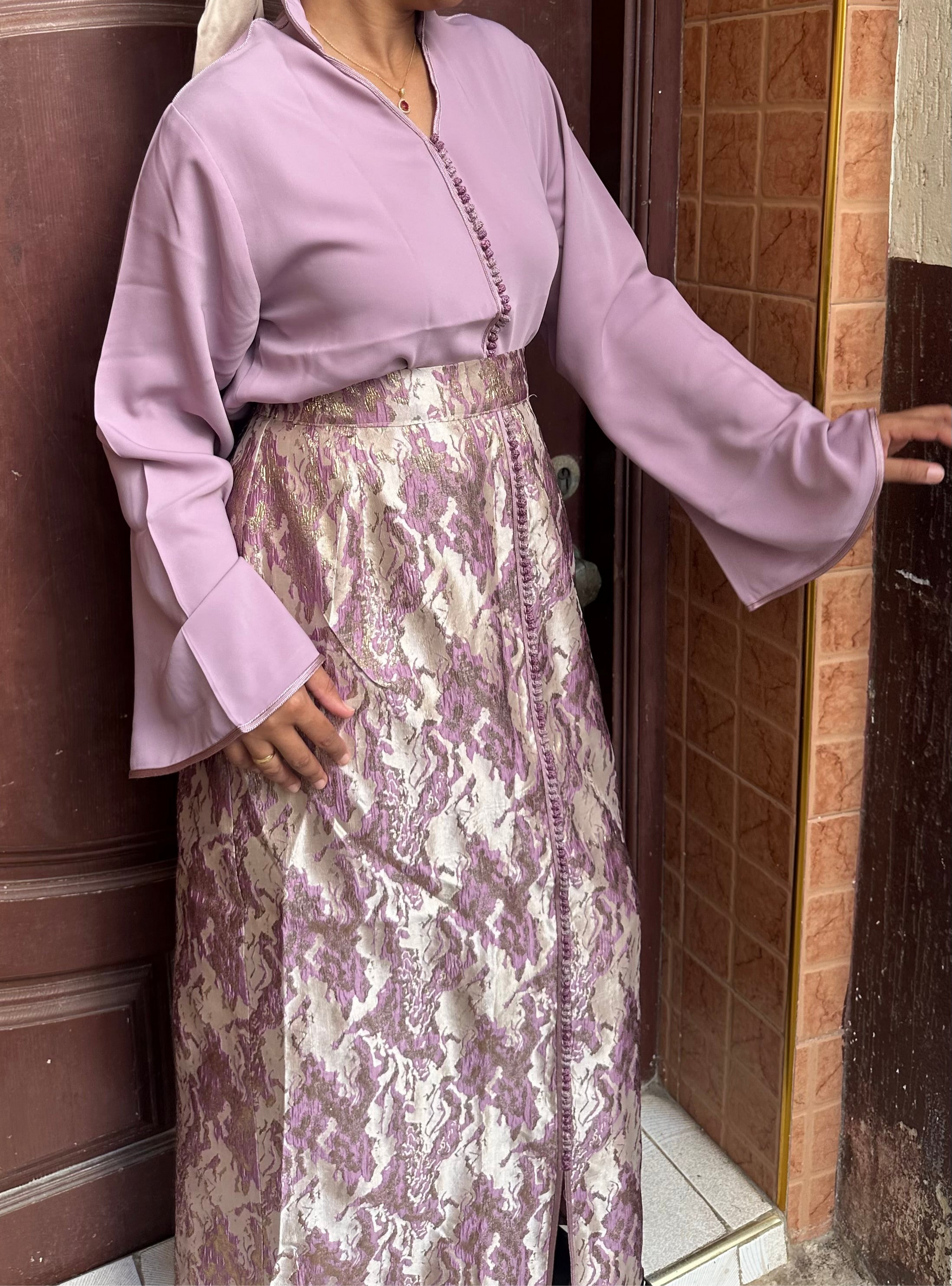 Un mélange délicat entre raffinement et modernité, avec ce chemisier en crêpe lila au col ouvert et cette jupe en brocard lila aux reflets dorés, subtilement structurée par sa fermeture sur le côté.