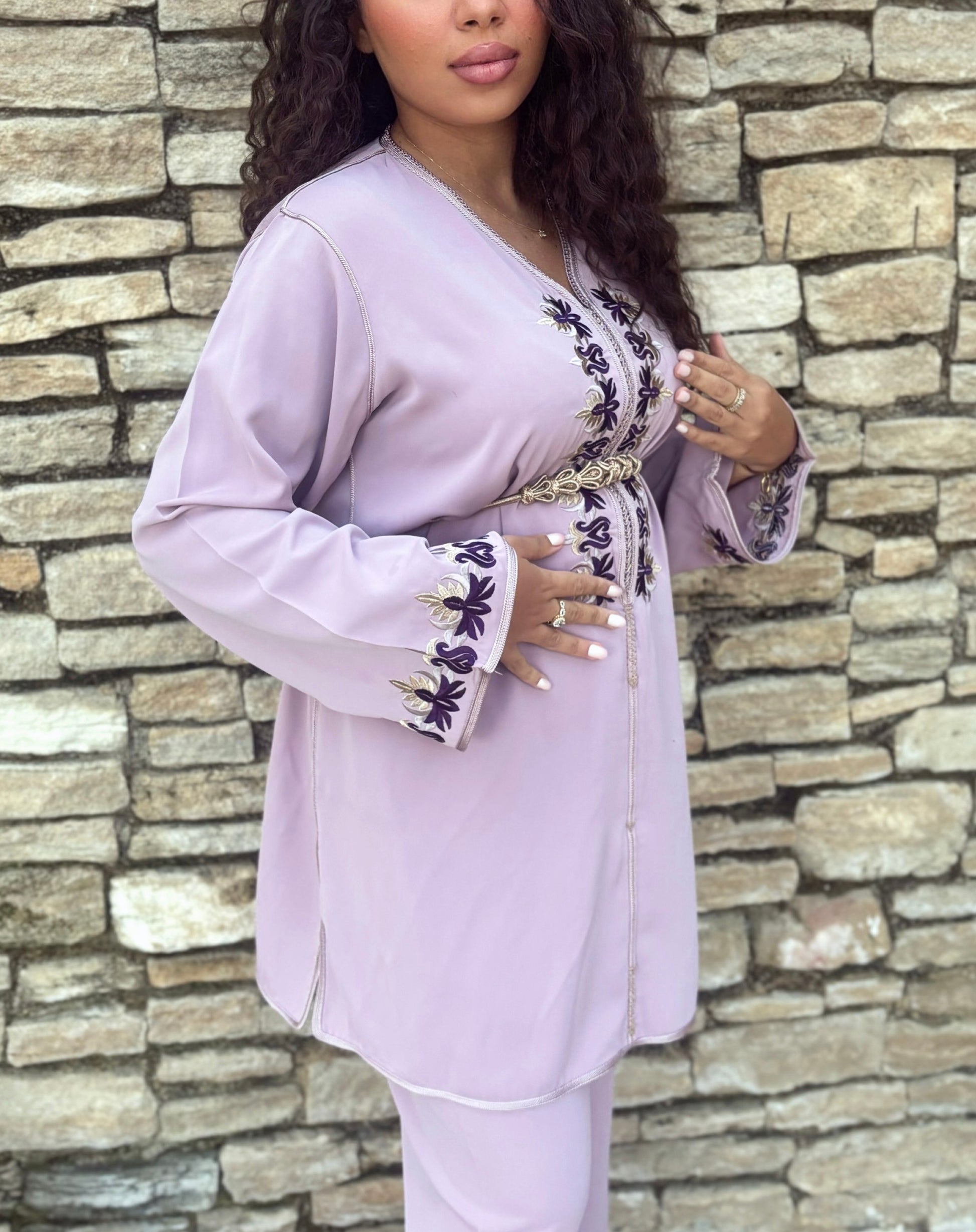 L'ensemble Hafsa Lila est sublimée par sa broderie violette et dorée réalisée à la main, véritable reflet de l'artisanat marocain. Une pièce unique où tradition et élégance se rencontrent pour magnifier voter allure. Fournit avec sa ceinture.