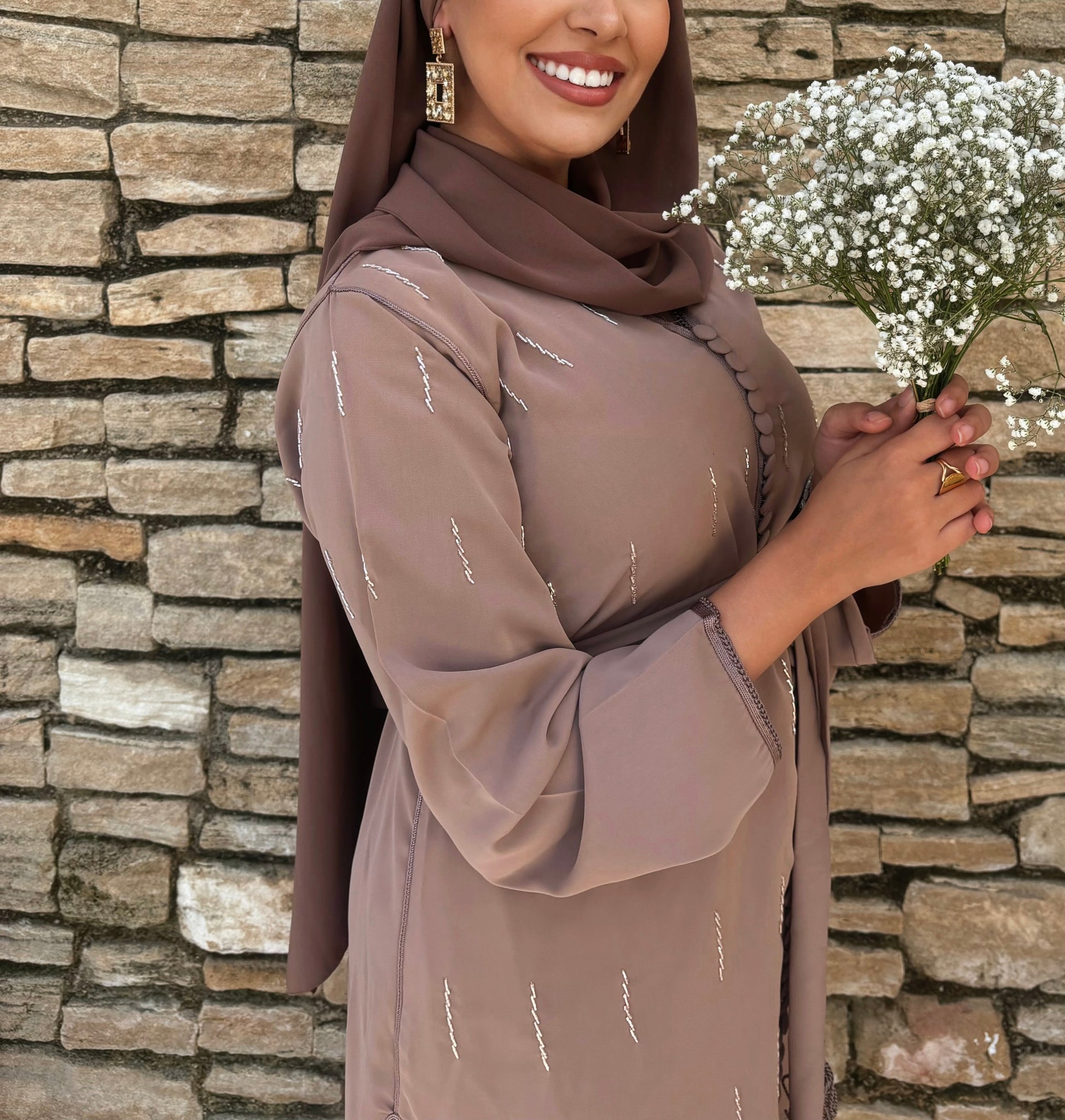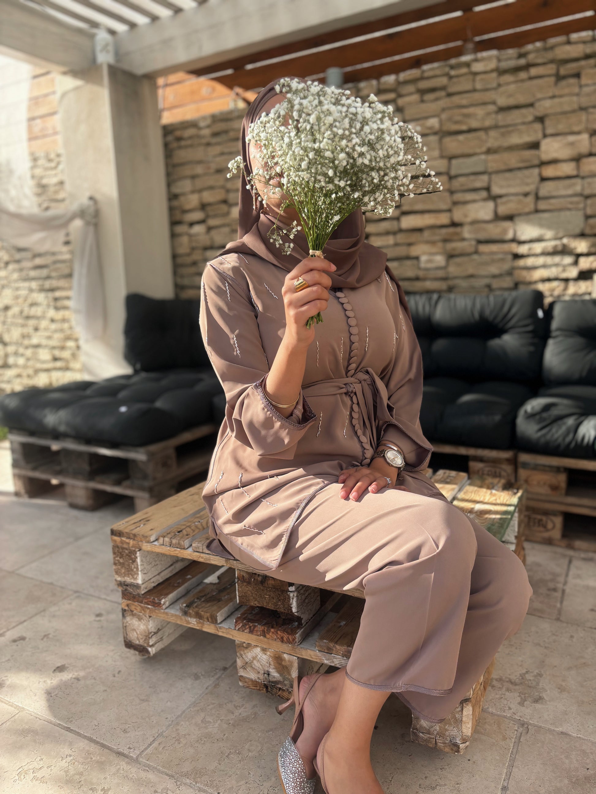 Découvrez cet élégant ensemble taupe qui allie modernité et tradition. Sublimé par des détails brodés délicats et sa ceinture Mejdoul nouée, il apporte une touche de raffinement à toutes vos occasions.