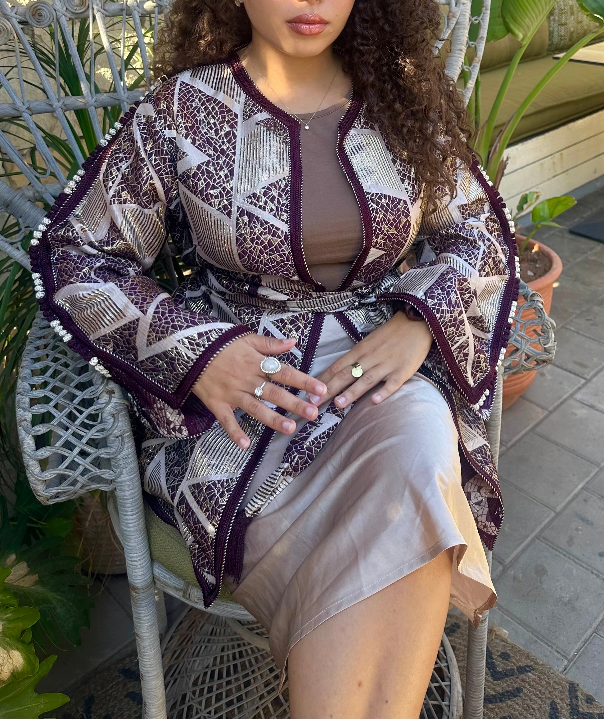 Un kimono en brocard prune au style raffiné, rehaussé de boutons le long des bras pour une touche originale, avec sfifa sur l’avant et mejdoul assorti.